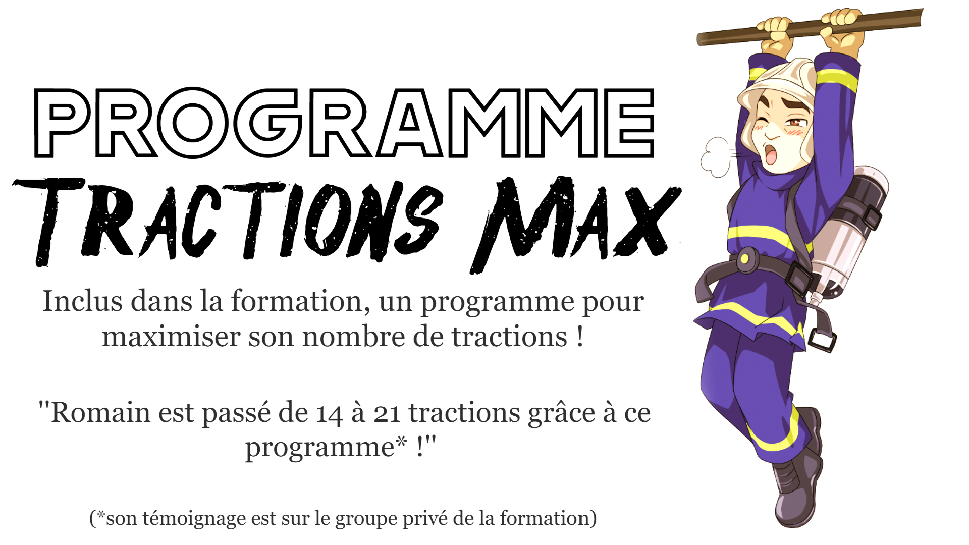 En plus de ce programme, tu bénéficieras du programme Traction Max, conçu pour maximiser ton nombre de tractions et te garantir des performances exceptionnelles lors du recrutement.